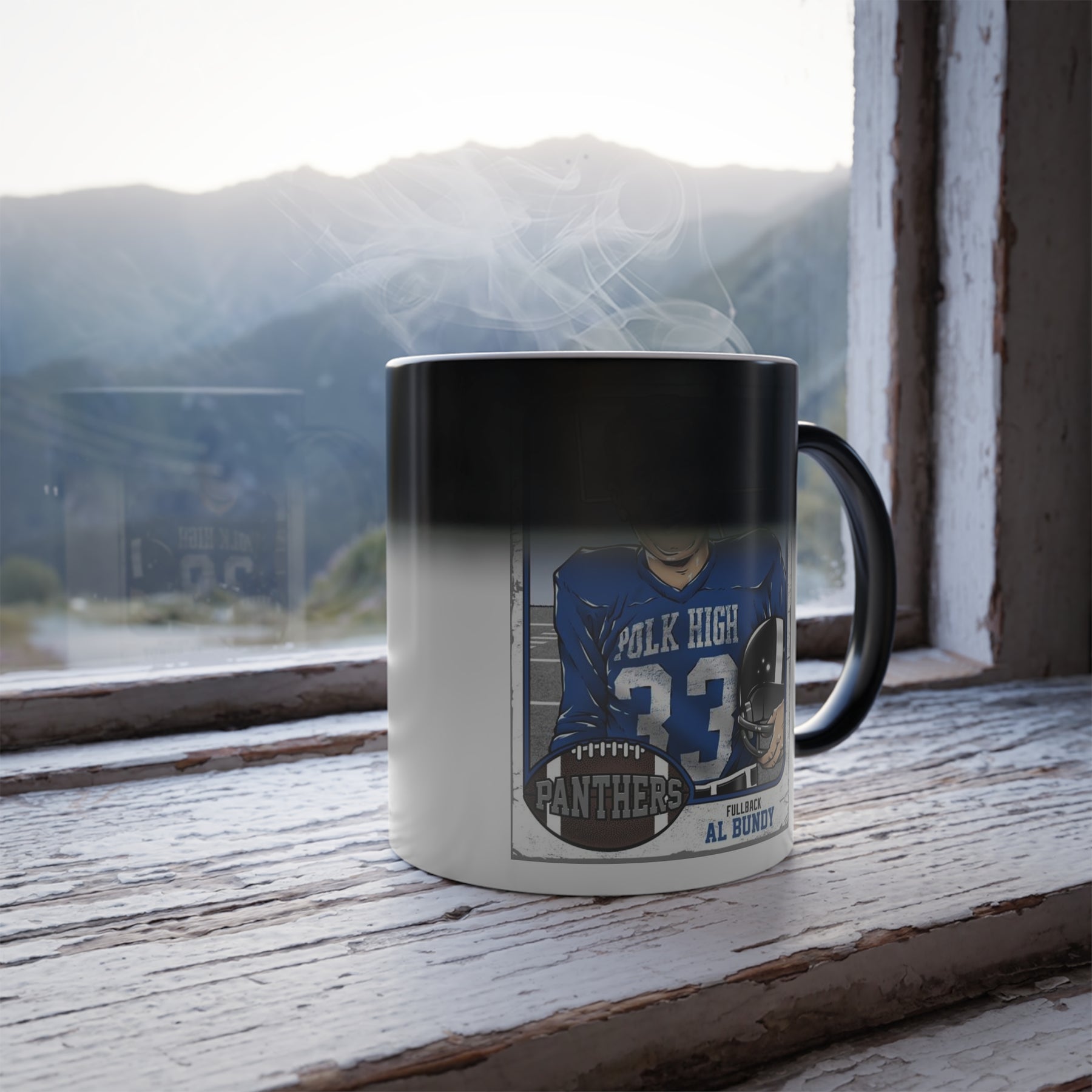 Relive Al Bundy's greatest glory days every morning. This 11 oz color morphing mug features a vintage-style Polk High Panthers football trading card design — and it comes to life right before your eyes.